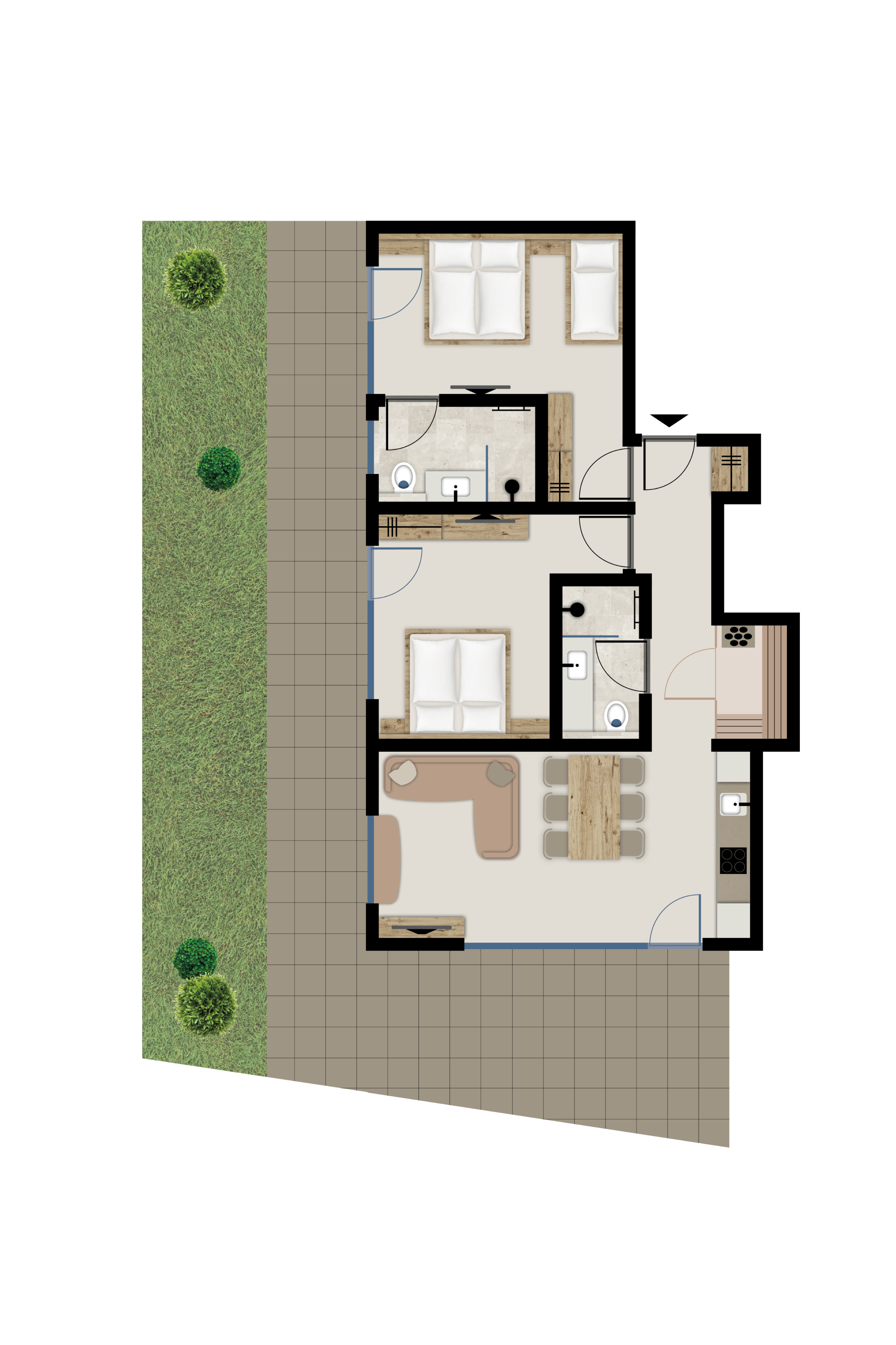 Die Wohnung befindet sich im Erdgeschoss und ist nach Süden & Osten ausgerichtet. Es gibt 3 Schlafzimmer (mit Doppelbett), 3 Badezimmer (Dusche/WC), eine private Sauna, eine Terrasse, eine sehr gut ausgestattete Küche und einen gemütlichen Wohn- und Essbereich.